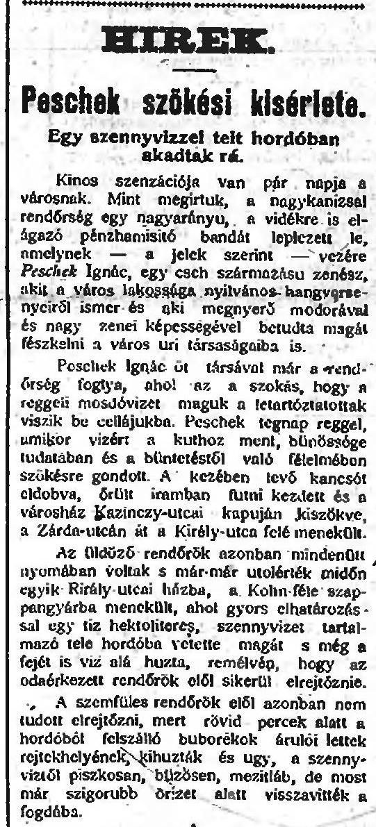 Ha az ember olvassa a kanizsai újságokat, szabályos folytatásos krimiben érezheti magát, ahogyan követi az eseményeket július közepe óta. Pesek szökése után jöttek is a híresztelések: állítólag találtak egy szénaboglyát, ahol pihenhetett valamennyit, aztán látni vélték, vagy tényleg látták Szepetneken, majd Rigyácon. Lovas rendőrök vették üldözőbe és bizony mégsem találták meg. Vakmerő szökése elnyerte jutalmát: sikerült átjutnia a Murán, valószínűleg korábbi csempész-kapcsolatai révén. Tíz év múlva a Zalai Közlöny valóságos filmjelenetként idézte fel a sztorit: szerinte már Pesek nyomában voltak a lovasrendőrök, amikor az utolsó pillanatban, kabátját levetve beleugrott a Murába, átúszta, és a túlsó partról még vissza is integetett tehetetlen üldözőinek. Ha belegondolunk, hogy akkor december legeleje volt, nem tartom túl valószínűnek, hogy tényleg így zajlott le, inkább az újságíró fantáziája működhetett. A lényeg azonban igaz.